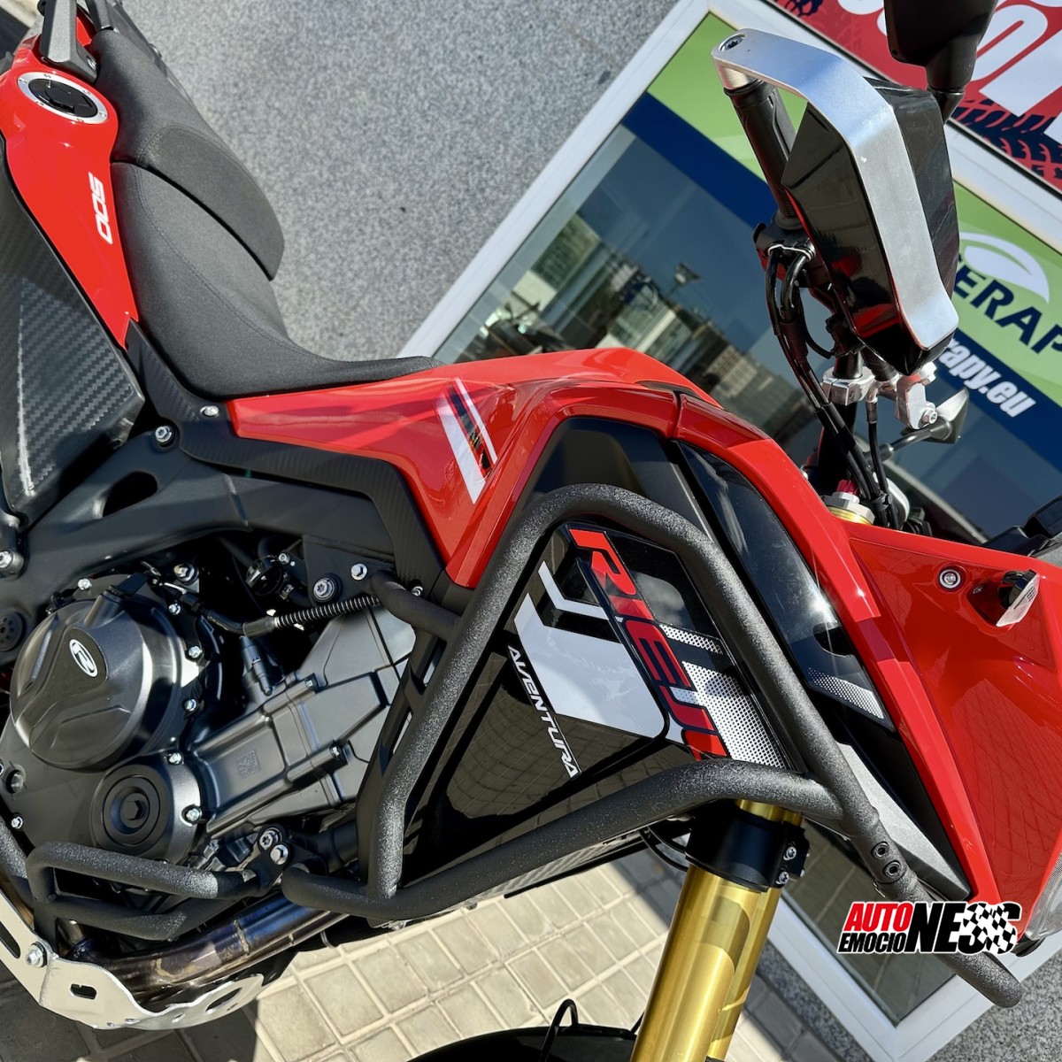 ¿UNA HONDA AFRICA TWIN 500?. Impresionante parecido a la carrocería de la Africa 1100 de ultima generación e igual similitud a su excelente motorización con la 500 X de la marca japonesa. Aunque las ventajas para la Rieju son muchísimas, doble deposito de combustible bien distribuidos (uno delante y otro detrás) que le aportan la autonomía mas grande que puedas encontrar en una moto a la venta en el territorio europeo, mayor a 1.000 kilómetros, de serie aporta cubre cárter, defensas bajas, defensas altas, cubre puños rígidos, llantas de radio de 21 y 18 pulgadas sin cámaras, Pantalla Display digital de 7? Suspensiones de 190 mm de recorrido, regulables en extension, compresión y precarga Avanzado Sistema ABS delantero y trasero. Desconectable para uso OffRoad Altura de asiento ideal para una conducción cómoda y manejable (840 mm). Preinstalacion de cámaras de video delantera y trasera. Apta para conducir con el carnet A2. Equilibrio perfecto entre comodidad y deportividad, tanto de pie como sentado, en carretera de asfalto y terrenos off-road. Podrás financiarla Integra o parcialmente y en unos muy amplios plazos con las mejores tasas del mercado. Recuerda que tenemos la mayor oferta en motos trail de las islas. Consulta, líneas móviles con WhatsApp.